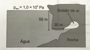 Um mergulhador fica preso ao explorar uma caverna no oceano. Dentro da caverna formou-se um bolsão de ar, como mostrado na figura, onde o mergulhador se abrigou.