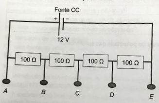 Um estudante tem uma fonte de tensão com corrente contínua que opera em tensão fixa de 12 V. Como precisa alimentar equipamentos que operam em tensões menores, ele emprega quatro resistores de 100 para construir um divisor de tensão. Obtém-se este divisor associando os resistores, como exibido na figura. Os aparelhos podem ser ligados entre os pontos A, B, C, D e E, dependendo da tensão especificada.