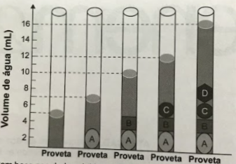 de um lote de quatro moedas A, B, C e D fabricadas supostamente de 100% cobre e massas 26 g, 27 g, 10g e 36 g, respectivamente. Com o objetivo de testar a densidade das moedas, foi realizado um procedimento em que elas foram sequencialmente inseridas em uma proveta contendo 5 mL de água, conforme