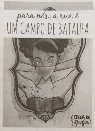 Essa campanha de conscientização sobre o assédio sofrido pelas mulheres nas ruas constrói-se pela combinação da linguagem verbal e não verbal. A imagem da mulher com o nariz e a boca cobertos por um lenço é a representação não verbal do(a)
