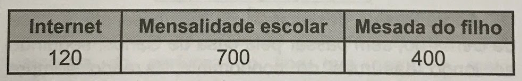 O quadro representa os gastos mensais, em real, de uma família com internet, mensalidade escolar e mesada do filho.