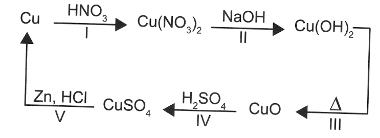 O ciclo do cobre é um experimento didático em que o cobre metálico é utilizado como reagente de partida. Após uma sequência de reações (I, II, III, IV e V), o cobre retorna ao seu estado inicial ao final do ciclo.