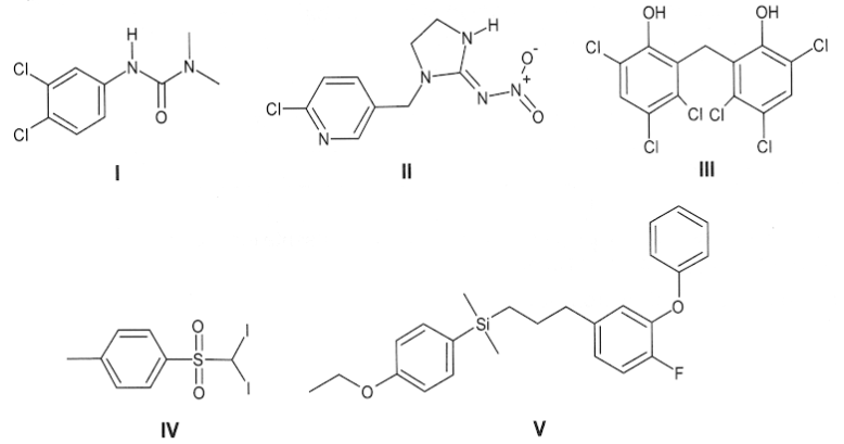 As águas subterrâneas têm sido contaminadas pelo uso de pesticidas na agricultura. Entre as várias substâncias usualmente encontradas, algumas são apresentadas na figura. A distinção dessas substâncias pode ser feita por meio de uma análise química qualitativa, ou seja, determinando sua presença mediante a adição de um reagente específico. O hidróxido de sódio é capaz de identificar a presença de um desses pesticidas pela reação ácido-base de Brönsted-Lowry.