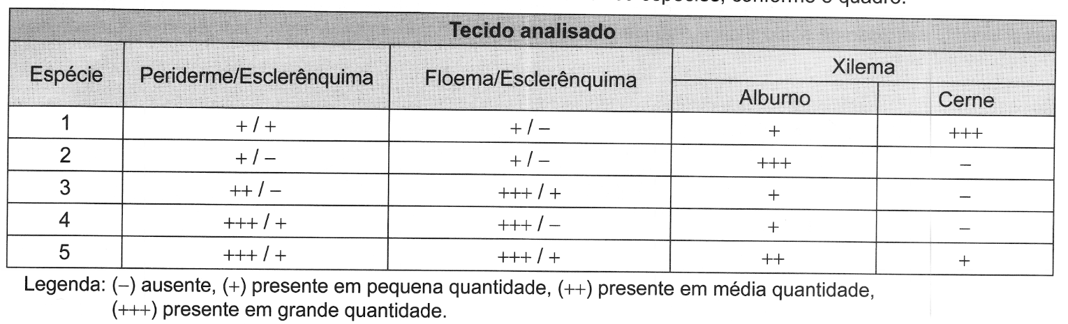 Com o objetivo de identificar a melhor espécie produtora de madeira para construção 9com resistência mecânica e à degradação), foram analisadas as estruturas anatômicas de cinco espécies, conforme o quadro.