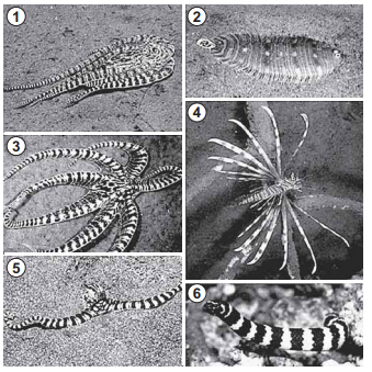 O polvo mimético apresenta padrões cromáticos e comportamentos muito curiosos. Frequentemente, muda a orientação de seus tentáculos, assemelhando-se a alguns animais. As imagens 1, 3, e 5 apresentam polvos mimetizando, respectivamente, um peixe-linguado (2), um peixe-leão (4) e uma serpente-marinha (6).