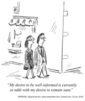 A Presença de “at odds with” na fala do personagem do cartum revela o(a)
