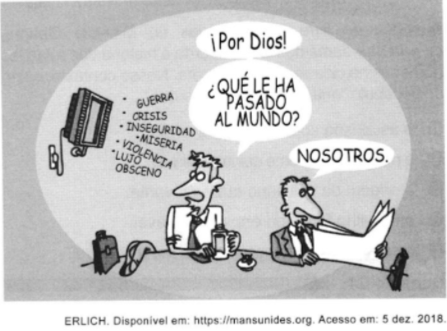 A charge evoca uma situação de assombro frente a uma realidade que assola as sociedades contemporâneas. Seu efeito humorístico reside na crítica diante do(a)