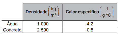 A variação da incidência de radiação solar sobre a superfície da Terra resulta em uma variação de temperatura ao longo de um dia denominada amplitude térmica. Edificações e pavimentações realizadas nas áreas urbanas contribuem para alterar as amplitudes térmicas dessas regiões, em comparação com regiões que mantêm suas características naturais, com presença de vegetação e água, já que o calor específico do concreto é inferior ao da água. Assim, parte da avaliação do impacto ambiental que a presença de concreto proporciona às áreas urbanas consiste em considerar a substituição da área concretada por um mesmo volume de água e comparar as variações de temperatura devido à absorção da radiação solar nas duas situações (concretada e alagada). Desprezando os efeitos da evaporação e considerando que toda a radiação é absorvida, essa avaliação pode ser realizada com os seguintes dados