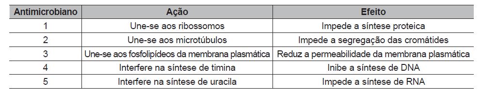 Antimicrobianos são substâncias naturais ou sintéticas que têm capacidade de matar ou inibir o crescimento de microrganismos. A tabela apresenta uma lista de antimicrobianos hipotéticos, bem como suas ações e efeitos sobre o metabolismo microbiano.