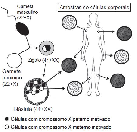Na figura está representado o mosaicismo em função da inativação aleatória de um dos cromossomos X, que ocorre em todas as mulheres sem alterações patológicas.
