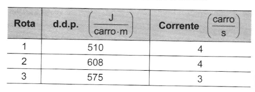 A fim de classificar as melhores rotas em um aplicativo de trânsito, um pesquisador propõe um modelo com base em circuitos elétricos. Nesse modelo, a corrente representa o número de carros que passam por um ponto da pista no intervalo de 1 s. A diferença de potencial (d.d.p.) corresponde à quantidade de energia por carro necessária para o deslocamento de 1 m. De forma análoga à lei de Ohm, cada via é classificada pela sua resistência, sendo a de maior resistência a mais congestionada. O aplicativo mostra as rotas em ordem crescente, ou seja, da rota de menor para a de maior resistência.