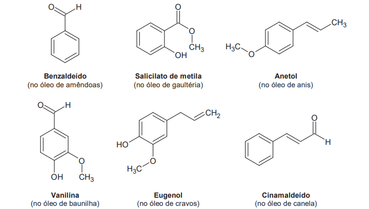 De modo geral, a palavra “aromático” invoca associações agradáveis, como cheiro de café fresco ou de um pão doce de canela.Associações similares ocorriam no passadoda história da químicaorgânica, quando os compostosditos “aromáticos” apresentavam um odor agradável e foram isolados de óleos naturais. À medida que as estruturas desses compostos eram elucidadas, foi se descobrindo que vários deles continham uma unidade estrutural específica. Os compostos aromáticos que continham essa unidade estrutural tornaram-se parte de uma grande família, muito mais com base em suas estruturas eletrônicas do que nos seus cheiros, como as substâncias a seguir, encontradas em óleos vegetais.