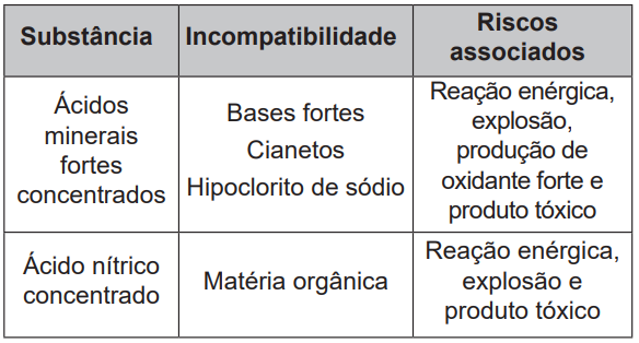 Os riscos apresentados pelos produtos dependem de suas propriedades e da reatividade quando em contato com outras substâncias. Para prevenir os riscos devido à natureza química dos produtos, devemos conhecer a lista de substâncias incompatíveis e de uso cotidiano em fábricas, hospitais e laboratórios, a fim de observar cuidados na estocagem, manipulação e descarte. O quadro elenca algumas dessas incompatibilidades, que podem levar à ocorrência de acidentes.