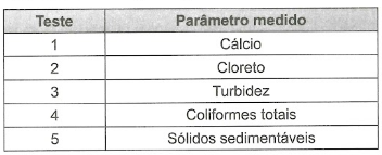 Em uma indústria, o controle da dureza da água é importante quando ela é utilizada em caldeiras, uma vez que sais pouco solúveis, formados a partir de sulfatos e carbonatos, podem acumular-se no interior das tubulações, causando obstruções. Para avaliar a água utilizada nessa indústria, foram realizados testes de qualidade que consideraram os seauintes parâmetros: