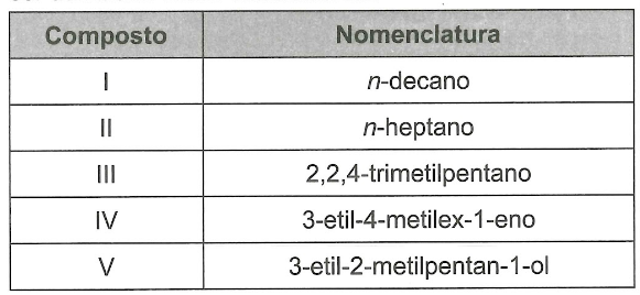 A gasolina é uma mistura de hidrocarbonetos de cadeias saturadas contendo de 8 a 12 átomos de carbono. Além disso, a gasolina de alto desempenho deve conter elevados teores de hidrocarbonetos de cadeias ramificadas, de forma a resistir à compressão e entrar em ignição apenas quando a vela aciona uma centelha elétrica no motor. No quadro, estão apresentados compostos que podem ser utilizados como combustíveis.