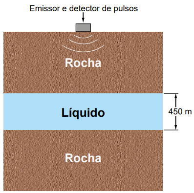 O petróleo é uma matéria-prima muito valiosa e métodos geofísicos são úteis na sua prospecção. É possível identificar a composição de materiais estratificados medindo-se a velocidade de propagação do som (onda mecânica) através deles. Considere que uma camada de 450 m de um líquido se encontra presa no subsolo entre duas camadas rochosas, conforme o esquema. Um pulso acústico (que gera uma vibração mecânica) é emitido a partir da superfície do solo, onde são posteriormente recebidas duas vibrações refletidas (ecos). A primeira corresponde à reflexão do pulso na interface superior do líquido com a camada rochosa. A segunda vibração deve-se à reflexão do pulso na interface inferior. O tempo entre a emissão do pulso e a chegada do primeiro eco é de 0,5 s. O segundo eco chega 1,1 s após a emissão do pulso