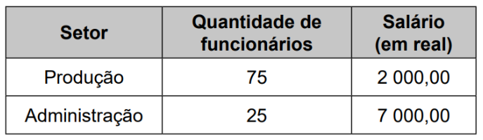Os funcionários de um mesmo setor recebem salários com valores iguais. O quadro apresenta a quantidade de funcionários por setor e seus respectivos salários.