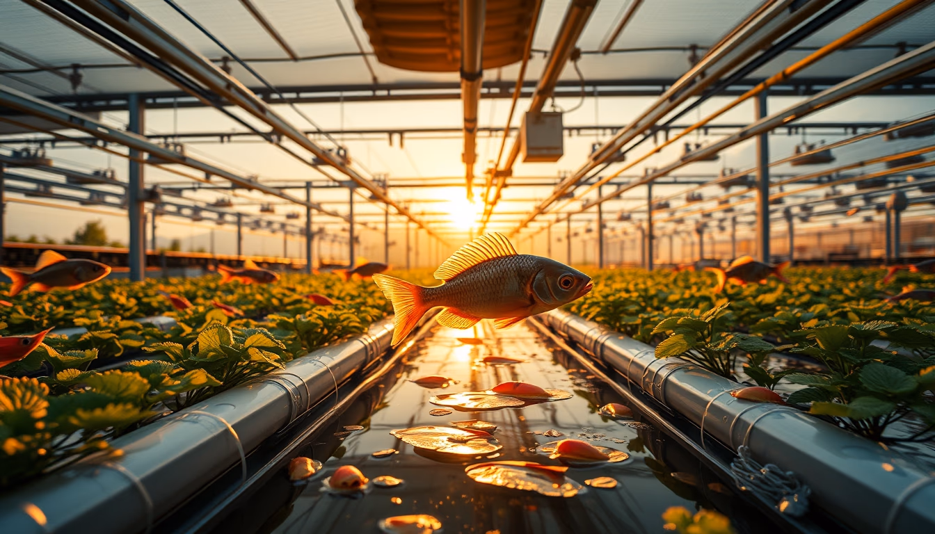 Editorial image of aquaponics system fish, cinematic wide shot.