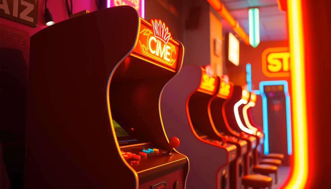 Editorial image of arcade machine retro neon, cinematic wide shot.