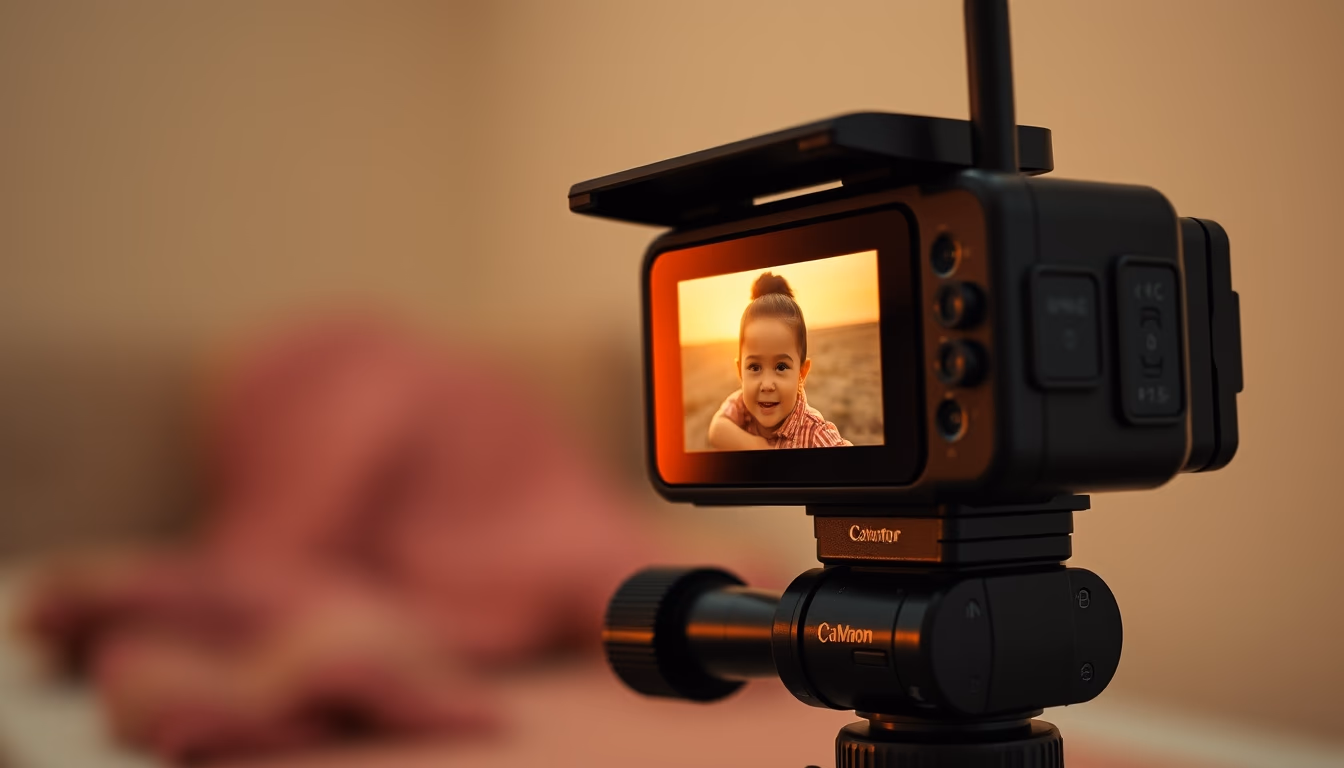 Editorial image of baby monitor camera, cinematic wide shot.