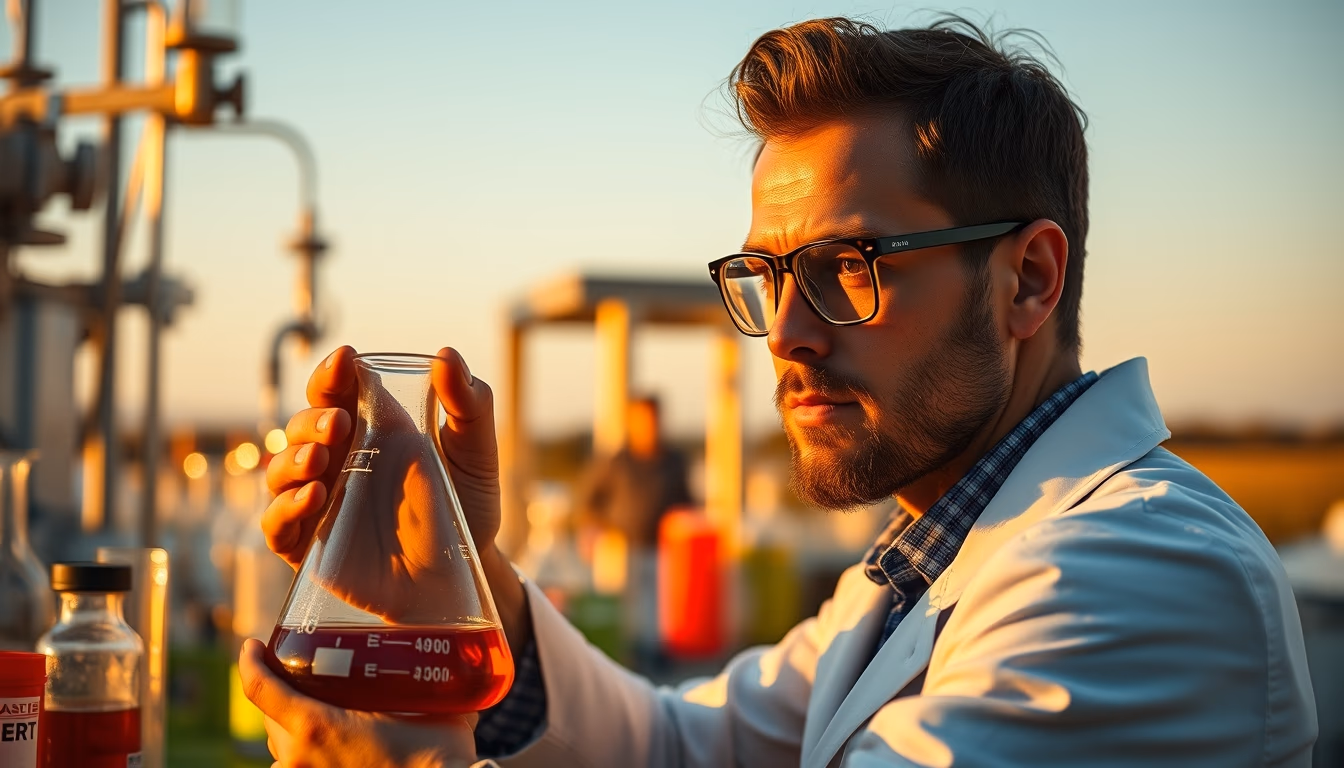 Editorial image of beaker with colored chemicals, cinematic wide shot.