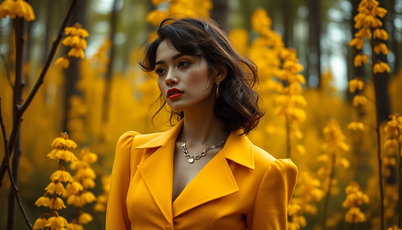Editorial image of chanterelle yellow forest, high fashion editorial.