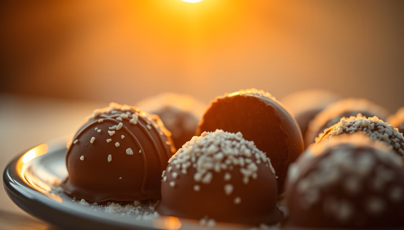 Editorial image of chocolate truffles closeup, cinematic wide shot.
