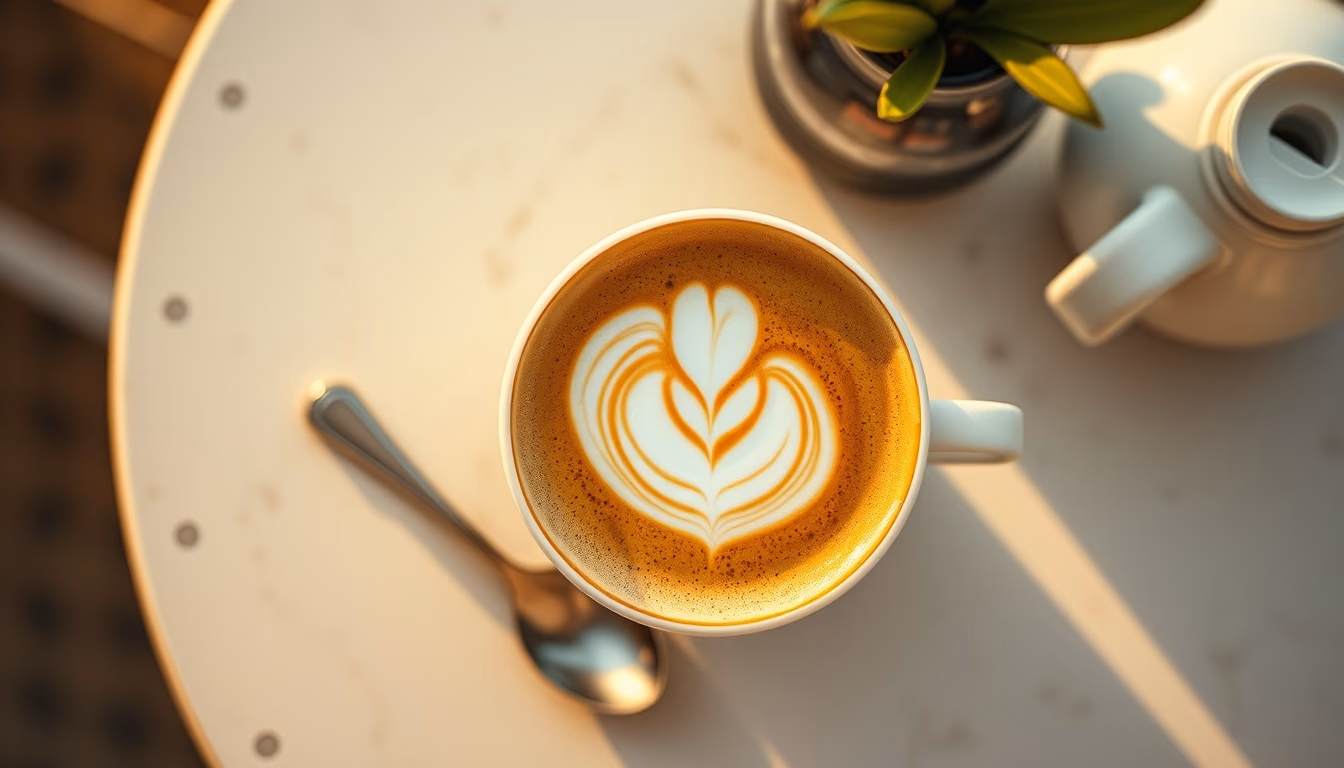 Editorial image of coffee with latte art top down, cinematic wide shot.