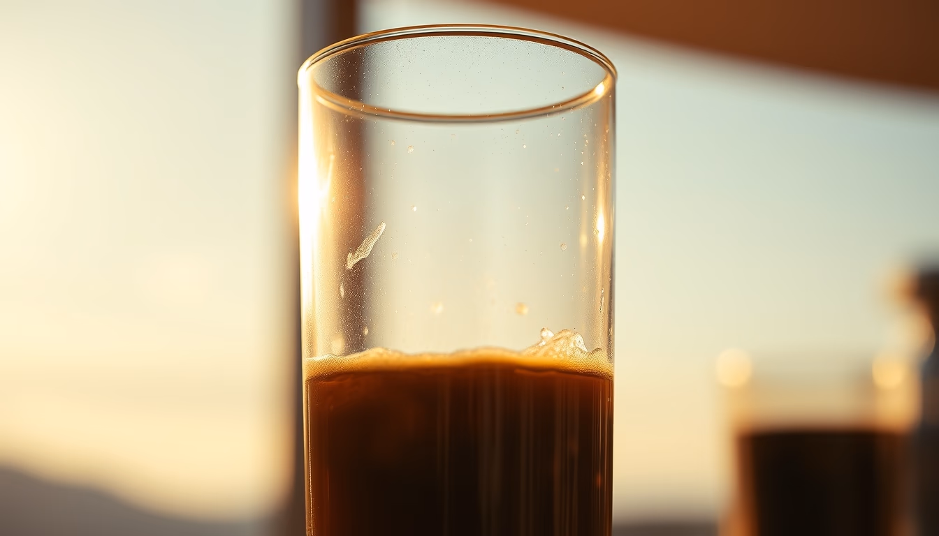 Editorial image of cold brew tower glass, cinematic wide shot.