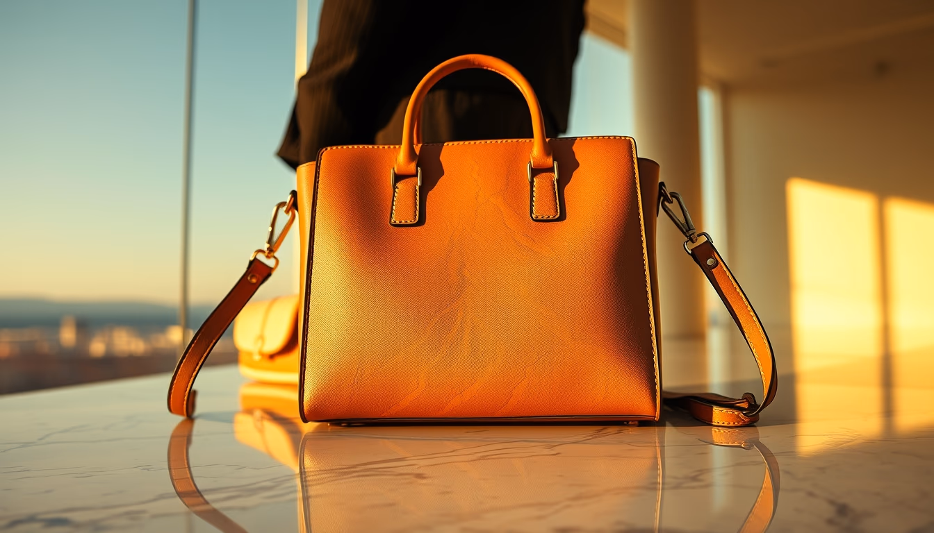 Editorial image of designer bag on marble, cinematic wide shot.