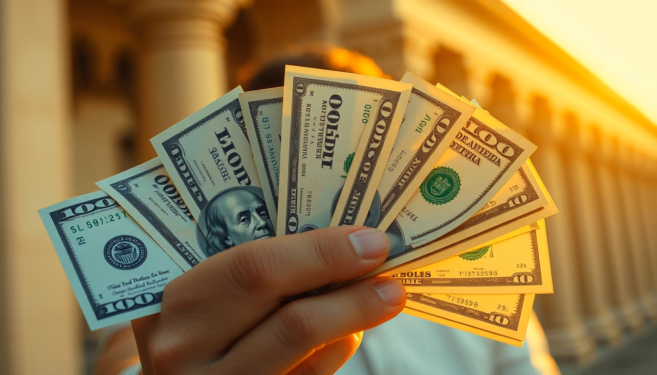 Editorial image of dollar bills fanned out artistically, cinematic wide shot.