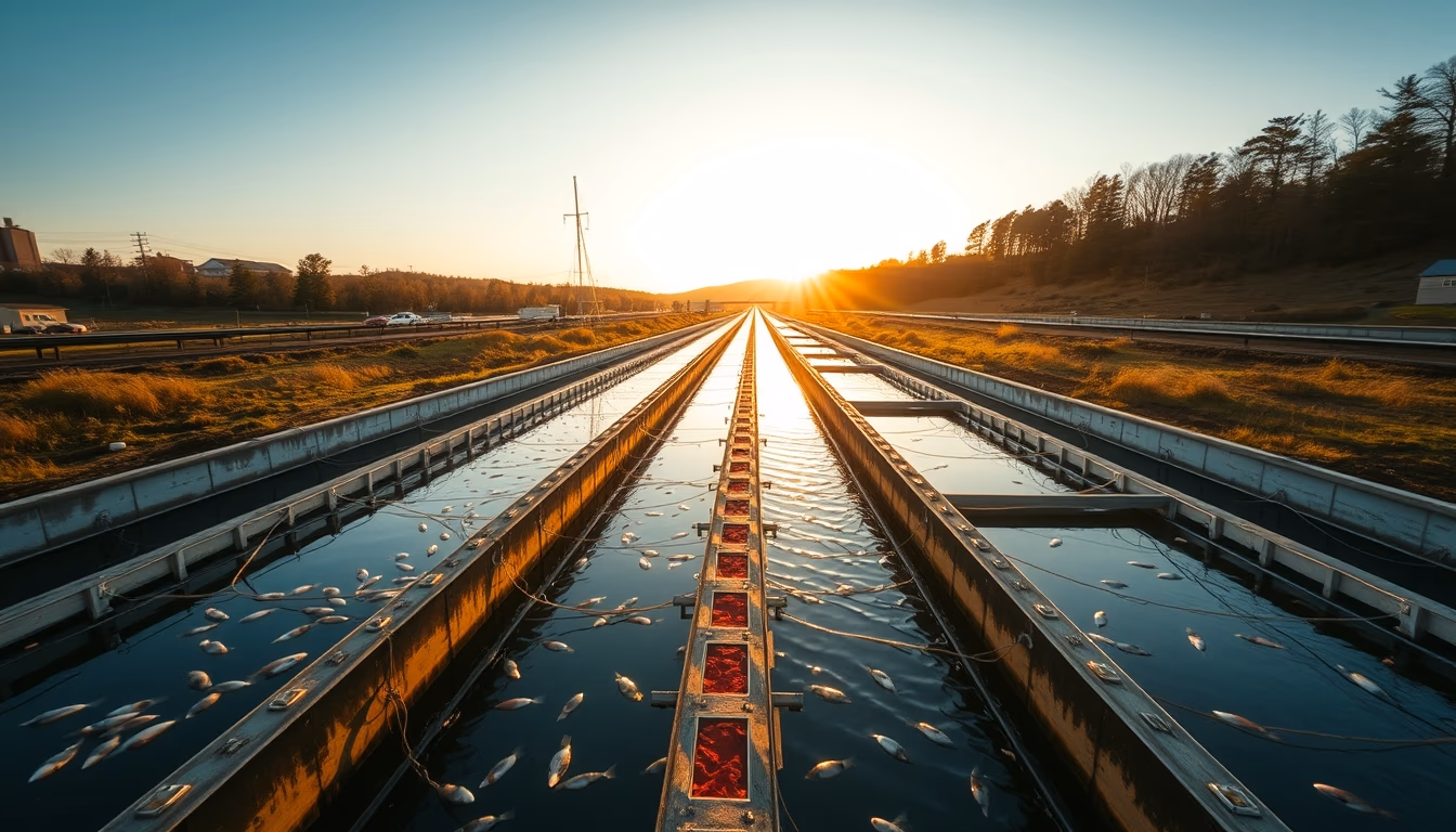 Editorial image of fish hatchery raceways, cinematic wide shot.