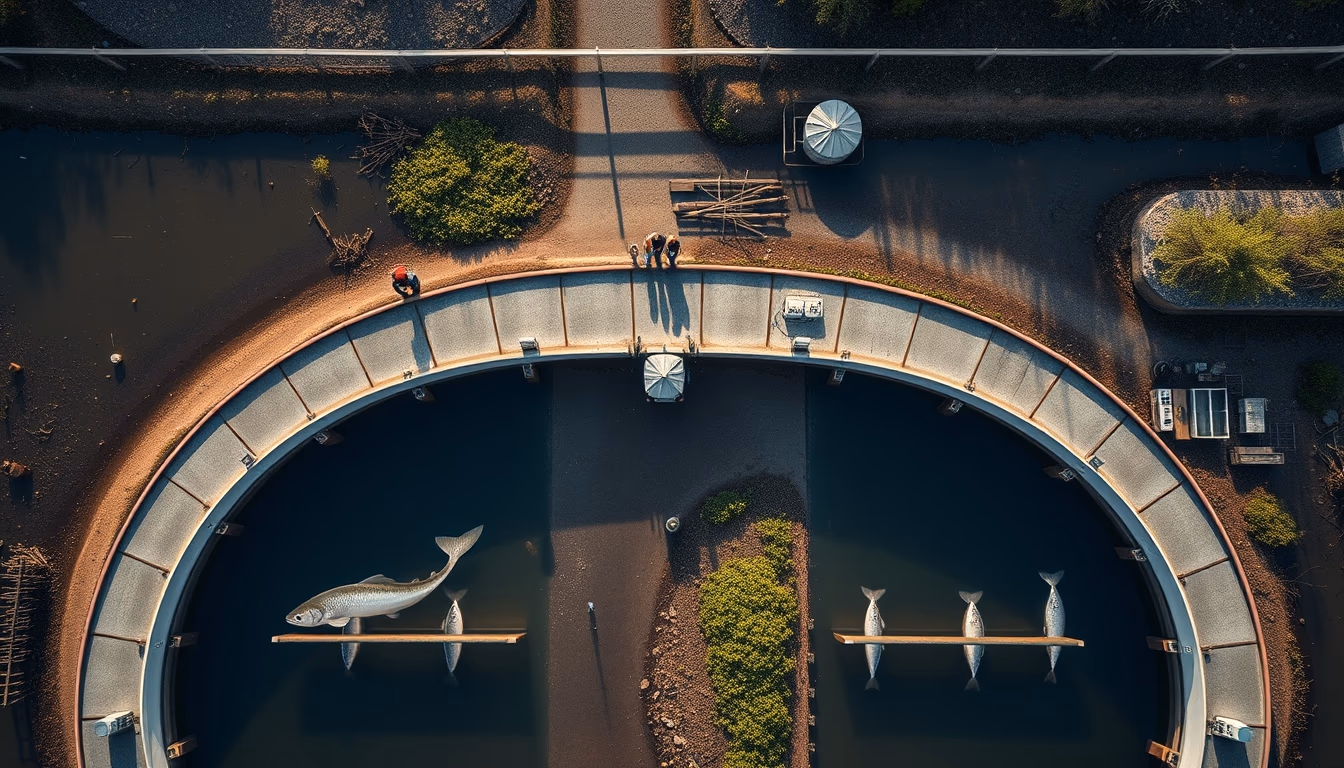 Editorial image of fish hatchery raceways, isometric flat lay.