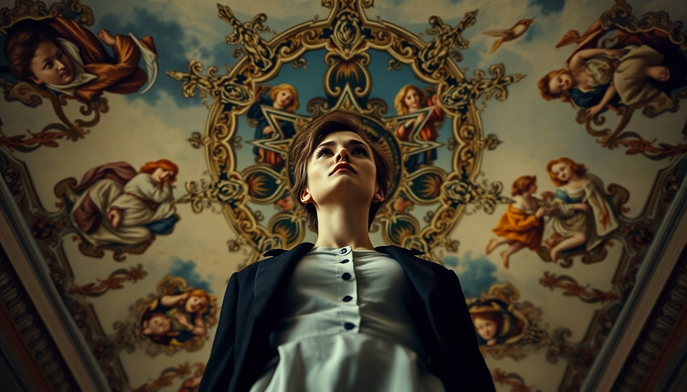 Editorial image of fresco painting ceiling, high fashion editorial.
