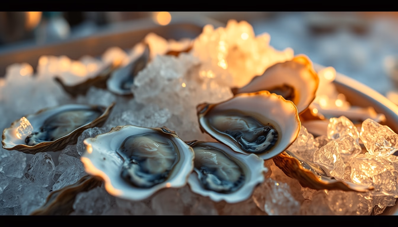 Editorial image of fresh oysters on ice, cinematic wide shot.