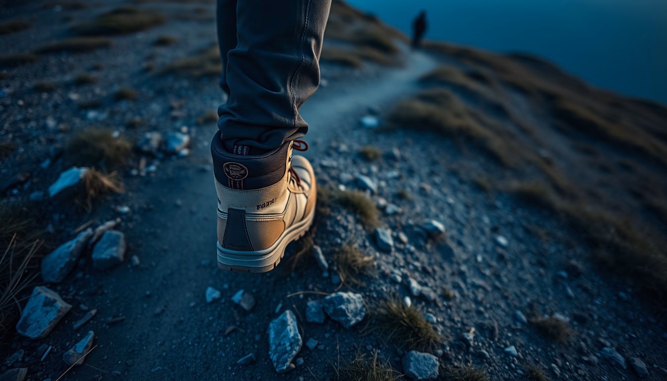 hiking boots on trail in editorial style