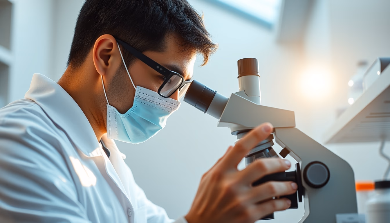 <a href="https://xn--utiliza-eza.com/en/imagens/lab-technician-looking-through-microscope-symmetric-bright-midday-2">Lab technician looking through microscope</a> by <a href="https://xn--utiliza-eza.com">UtilizAí</a>, licensed under <a href="https://creativecommons.org/licenses/by/4.0/">CC BY 4.0</a>.