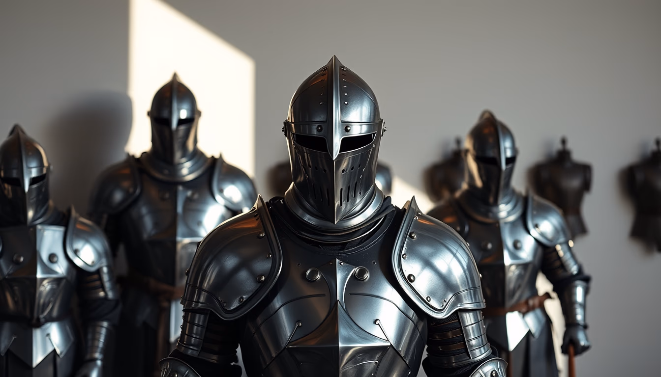 Editorial image of medieval armor display, minimalist composition.