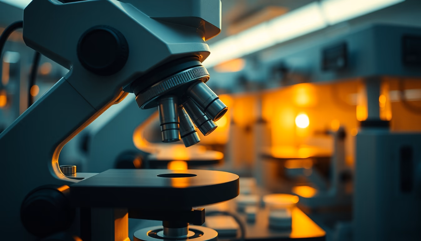 Editorial image of microscope view cell culture, cinematic wide shot.