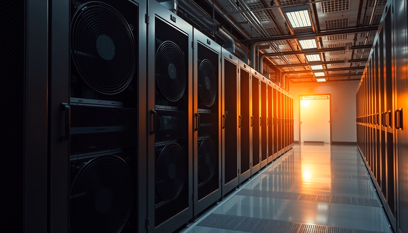 Editorial image of modern data center cooling system, cinematic wide shot.