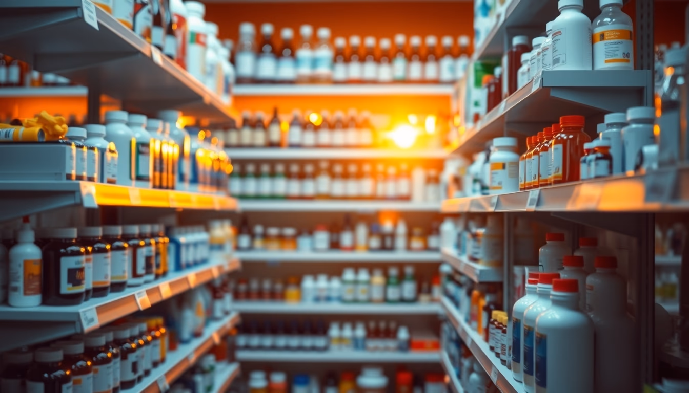 Editorial image of pharmacy shelves row of bottles, cinematic wide shot.