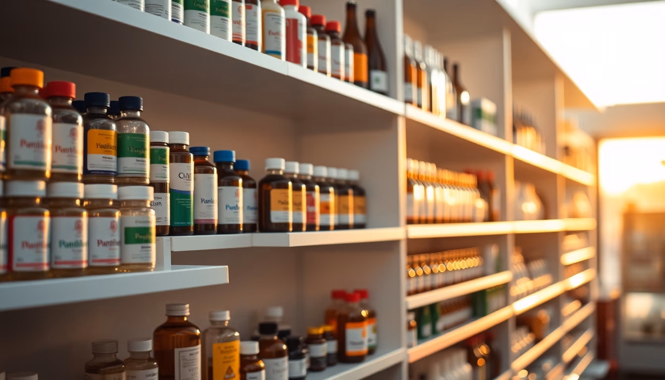 Pharmacy shelves row of bottles