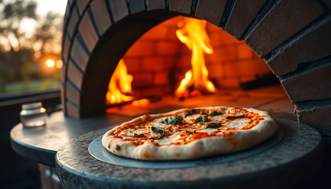 Editorial image of pizza margherita wood fired oven, cinematic wide shot.