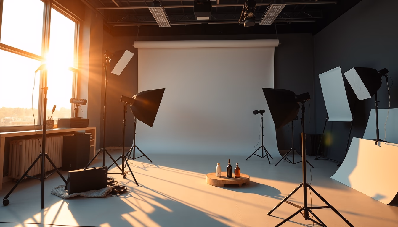 Editorial image of product photography studio setup, cinematic wide shot.
