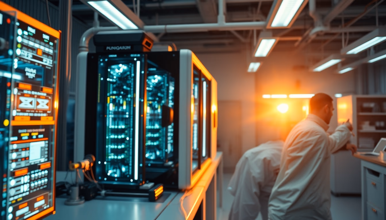 Editorial image of quantum computer in research lab, cinematic wide shot.