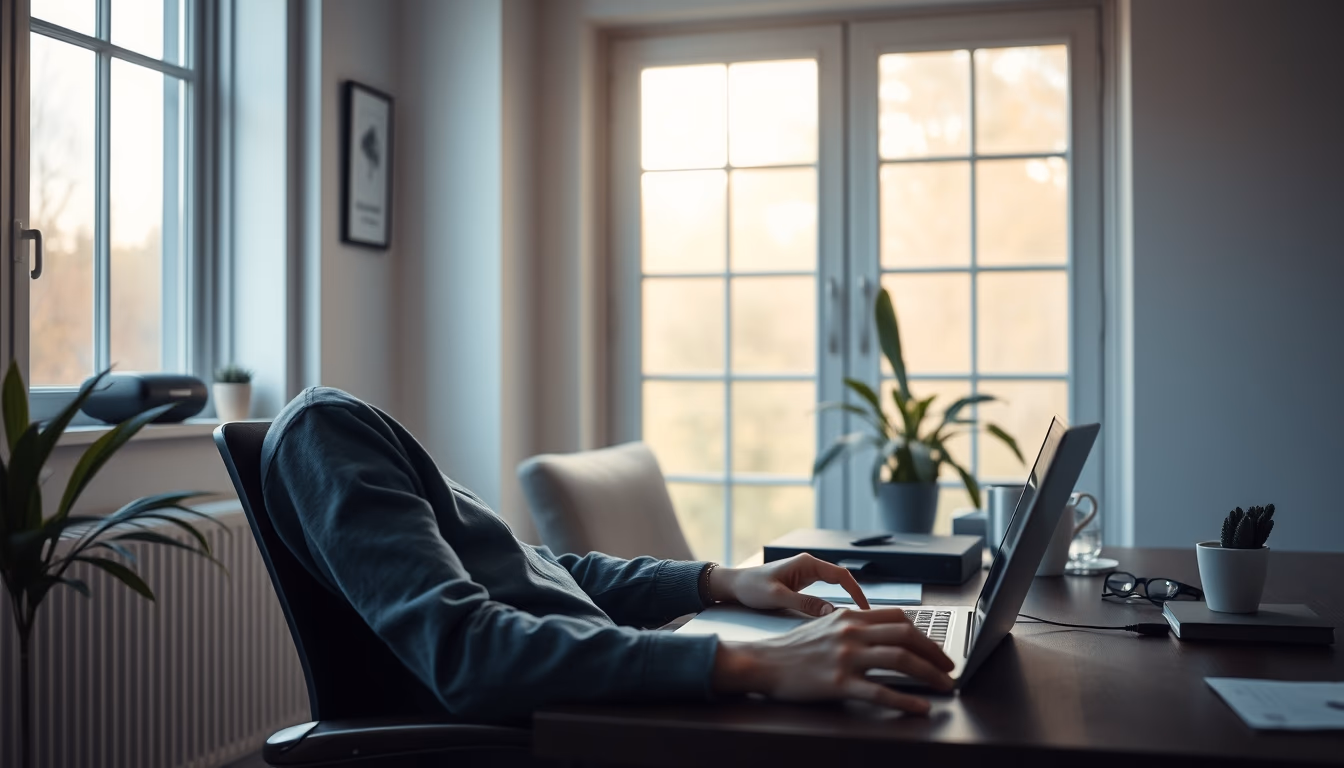 Remote worker in home office with coffee and laptop