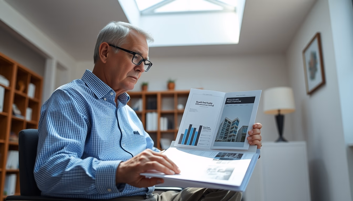 Editorial image about real estate funds. retired investor reviewing real estate fund portfolio, with bright midday natural light. Useful for articles about real estate funds in Brazil.