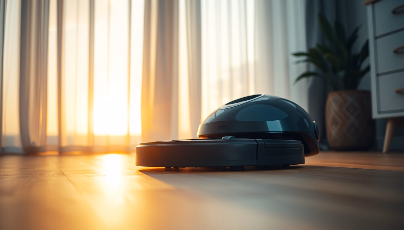 Editorial image of robot vacuum on floor, cinematic wide shot.