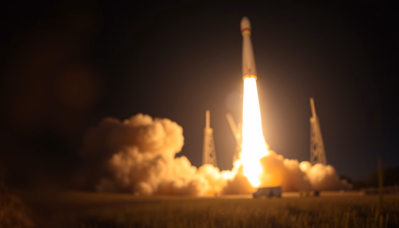 Editorial image of rocket launch night, macro closeup.