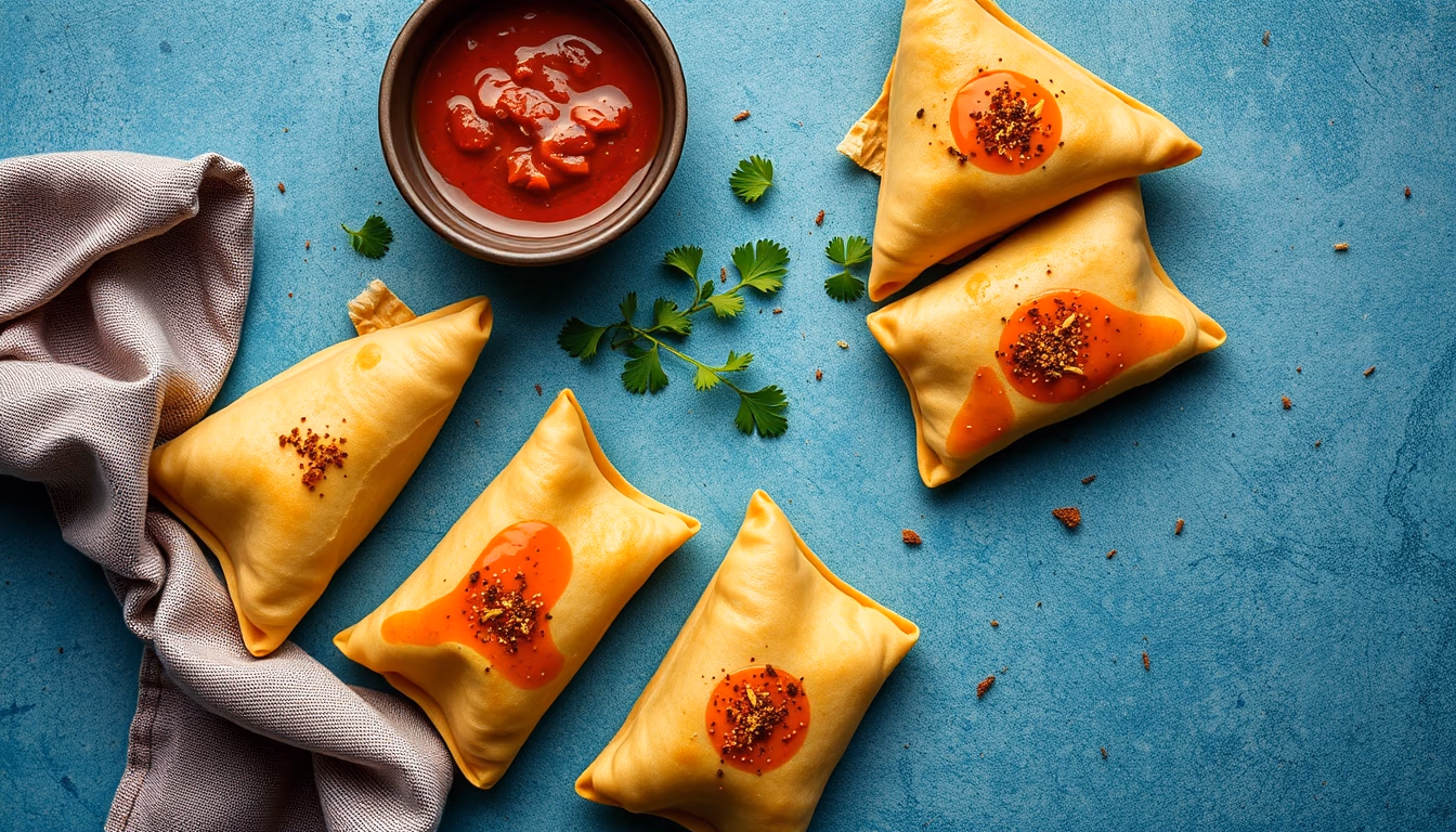 Editorial image of samosas spiced, isometric flat lay.